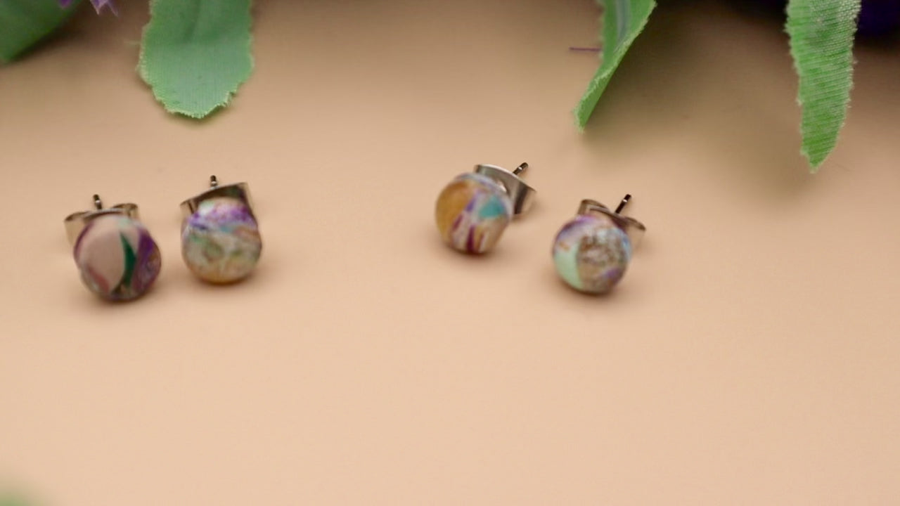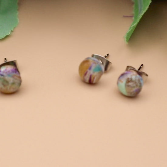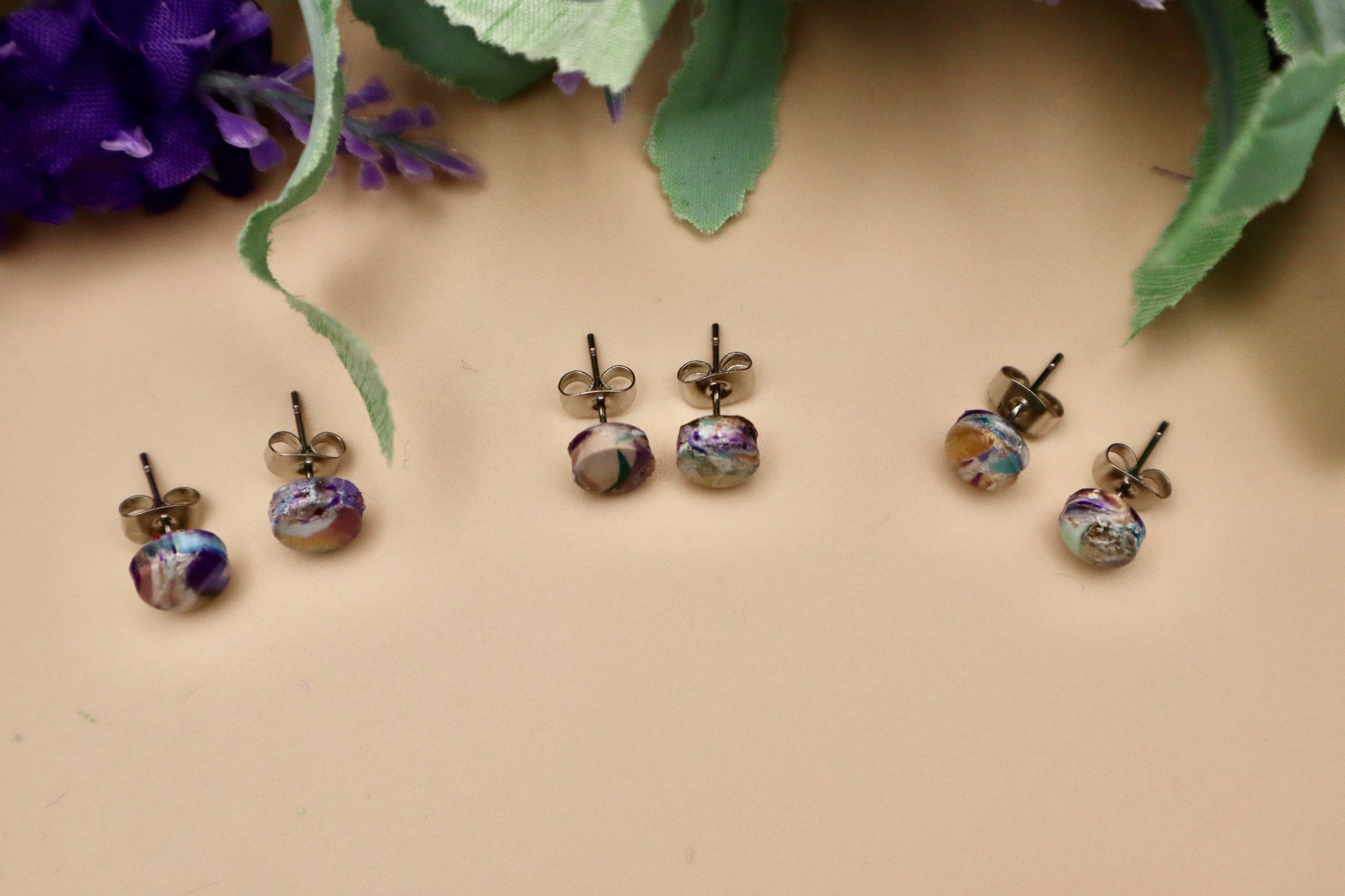 These marble stud earrings are made with polymer clay and UV resin. Each stud is about 8mm wide and 5mm deep