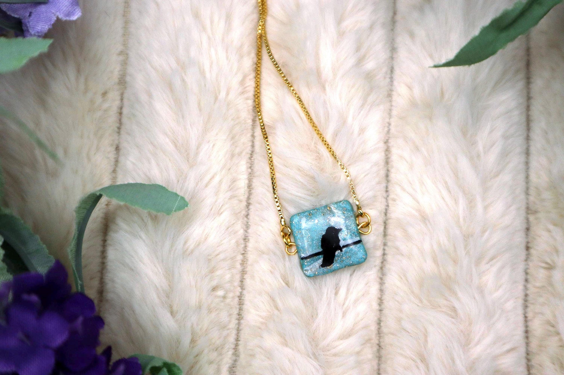This pendant is made with polymer clay, acrylic paint, and UV resin. The pendant is about 0.5in tall, 0.5in wide, and about 5mm thick. This necklace is made with a stirling silver plated stainless steel 9.05in chain that has an adjustable clasp.