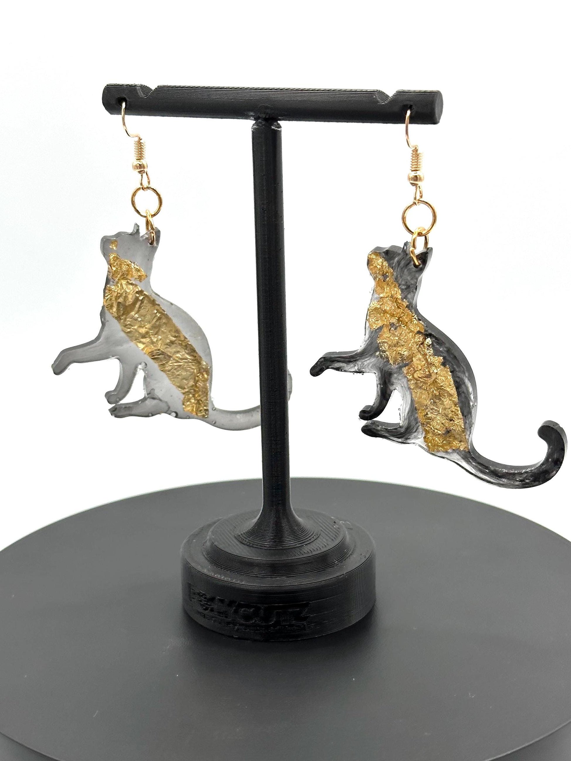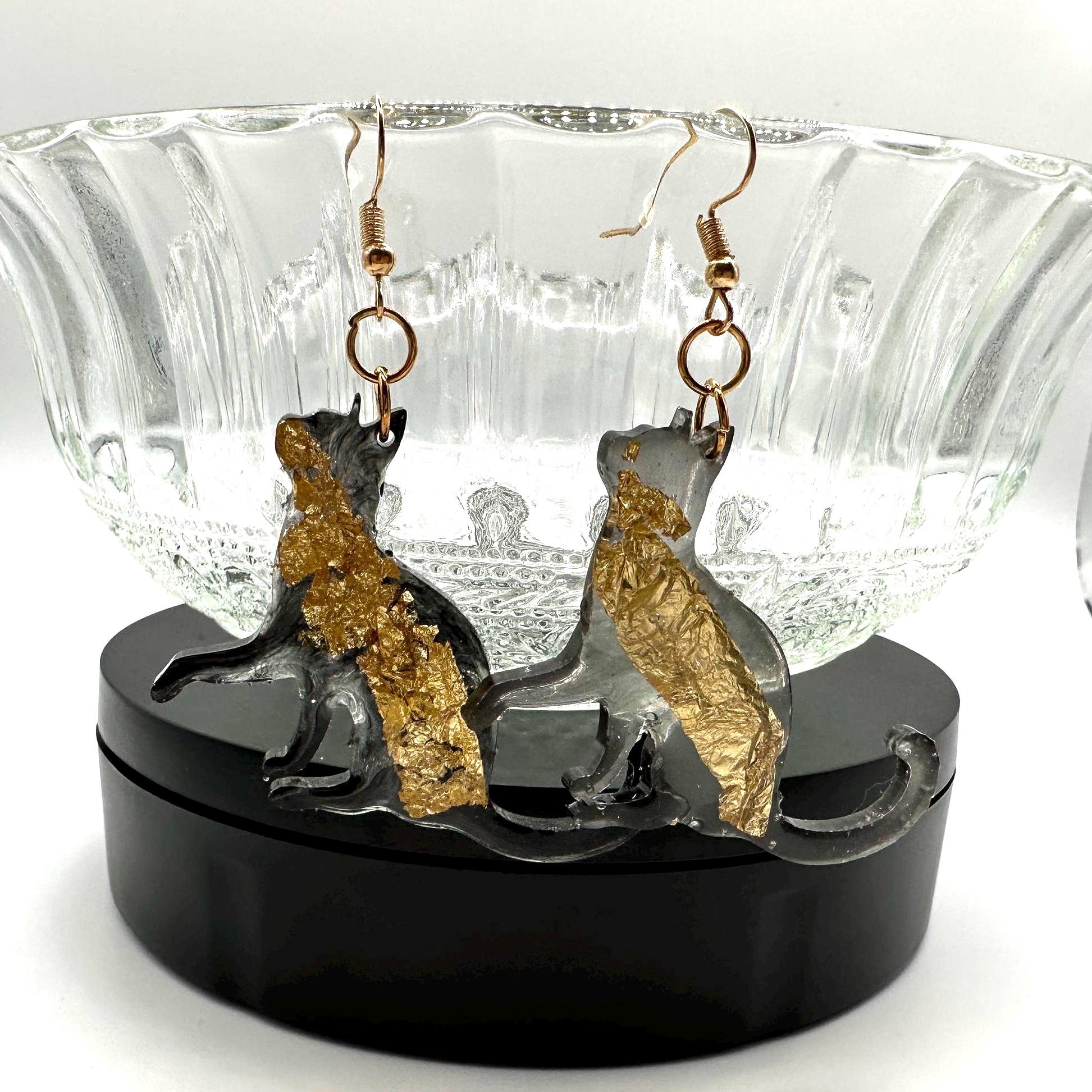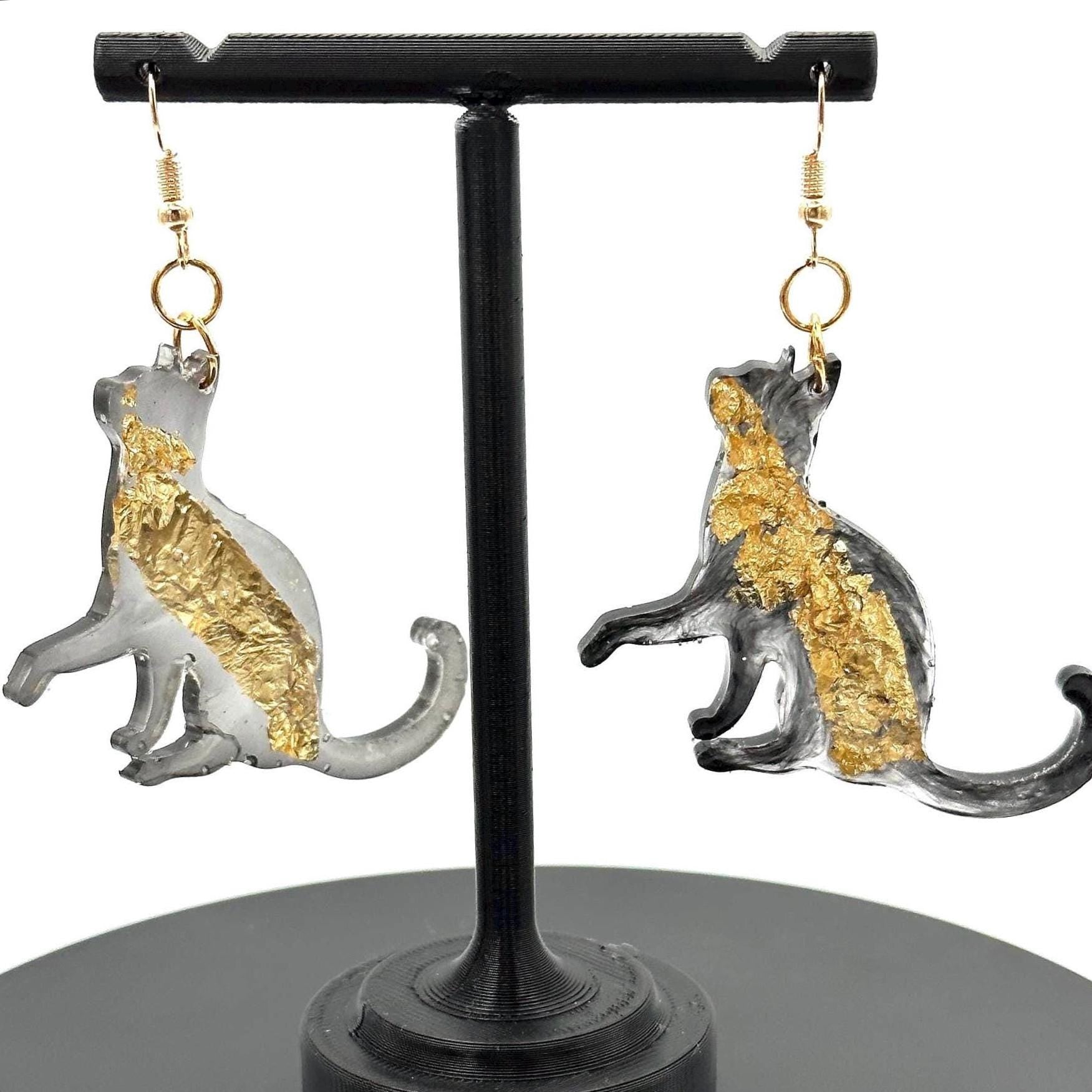 These brass and resin cat shaped dangle earrings were made with UV Resin and gold foil flakes. The charms are about 44mm tall so the earrings dangle at around 77mm.