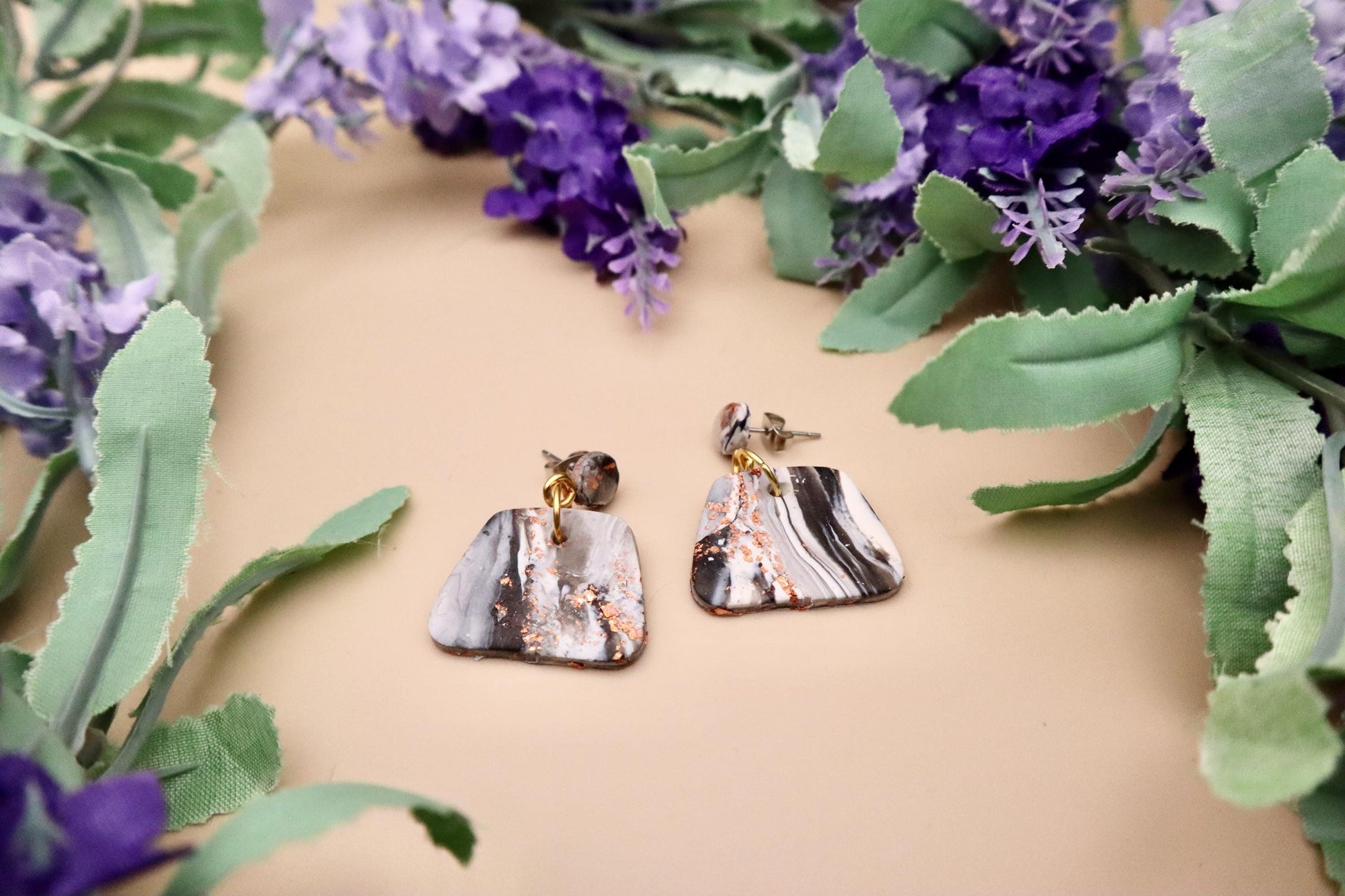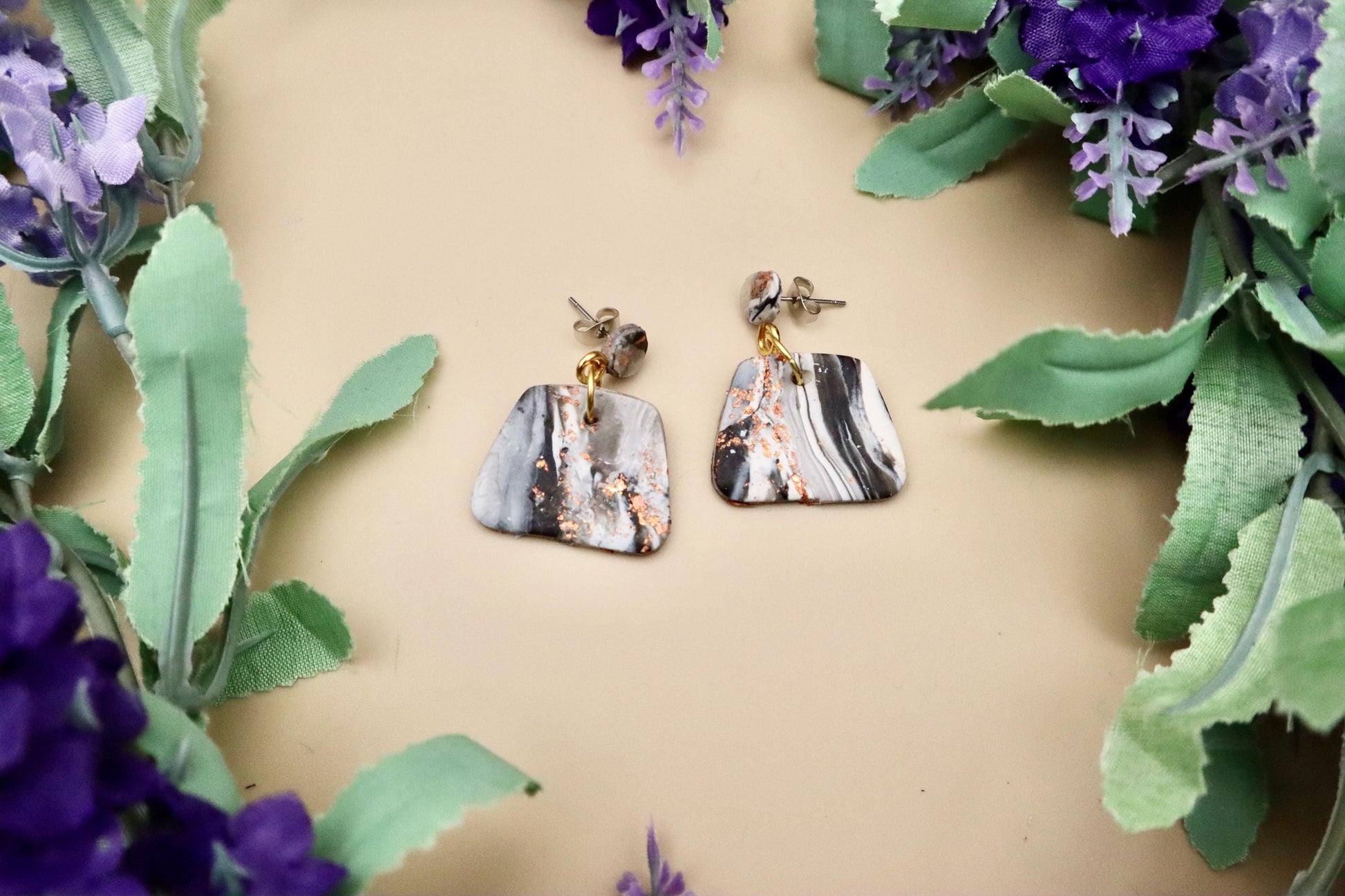 Black, White, and Rose Gold Marble Polygon Dangle Earrings | Polymer Clay