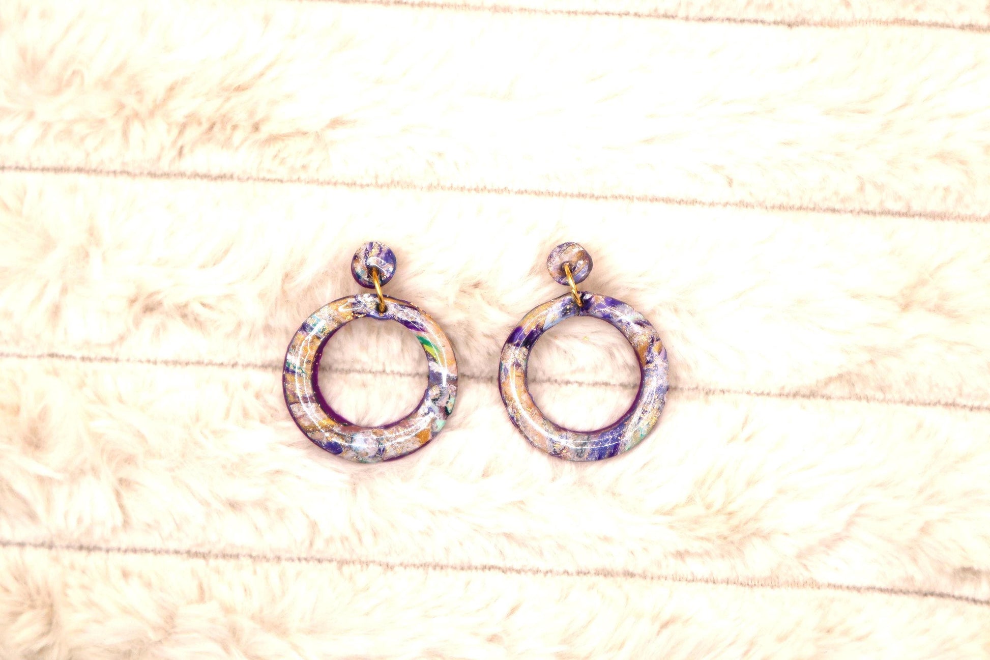 These donut purple marble earrings are made with polymer clay , UV resin, and steel. The charms are about 32mm tall. They dangle at around 40mm and come with metal backs.