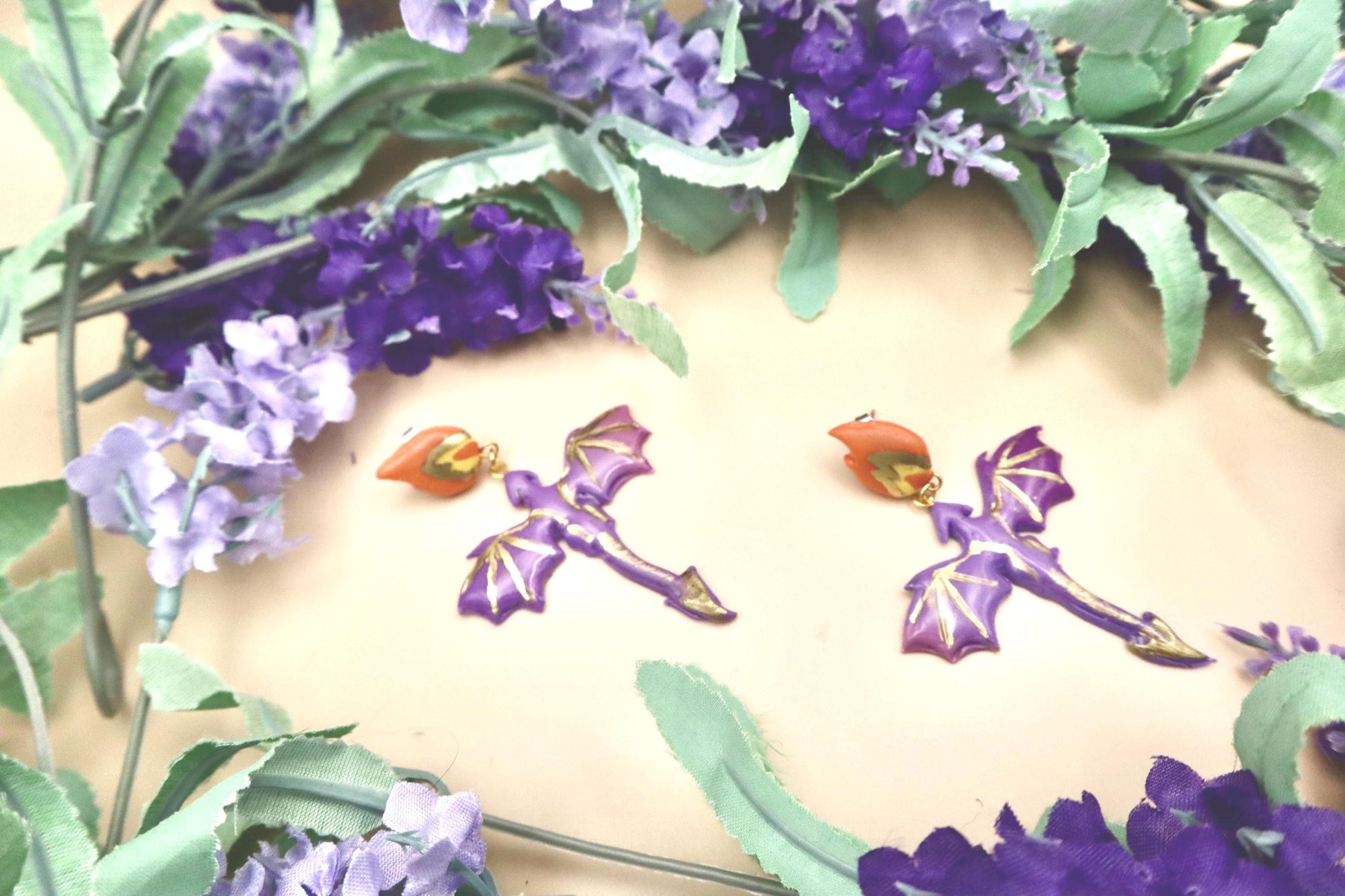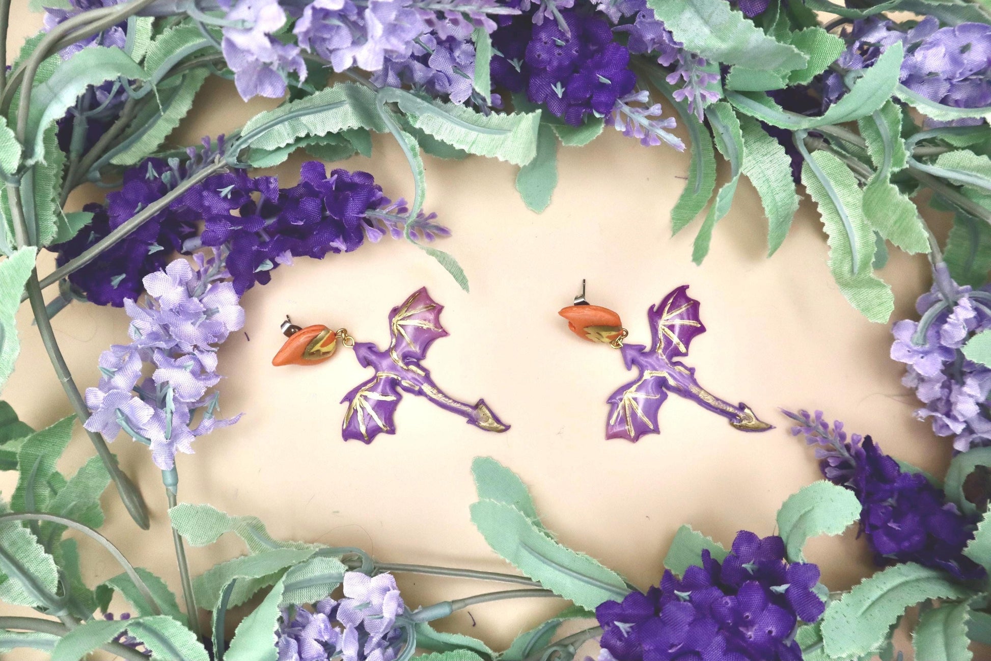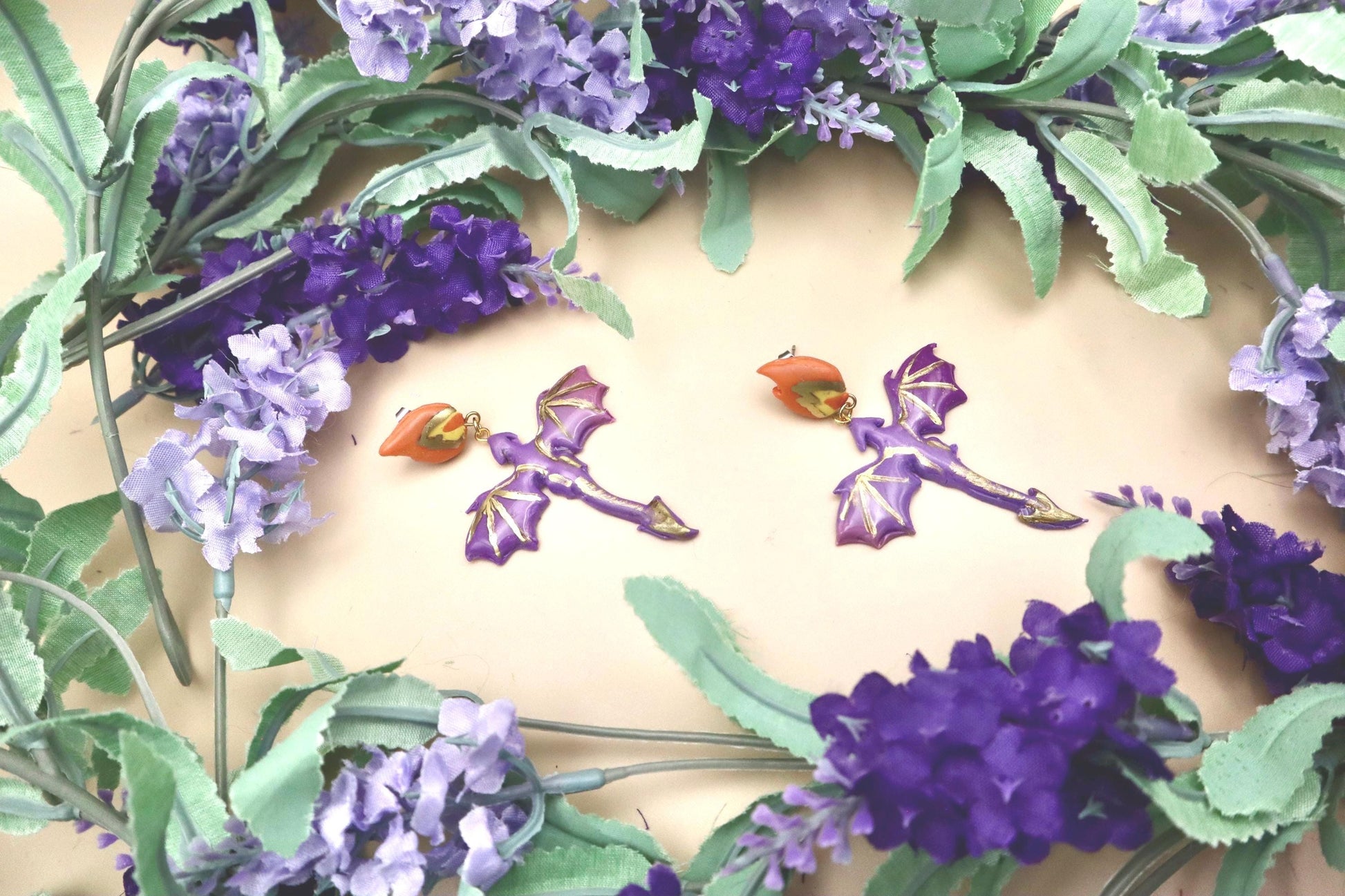 Fire Breathing Purple & Gold Dragon Dangle Earrings