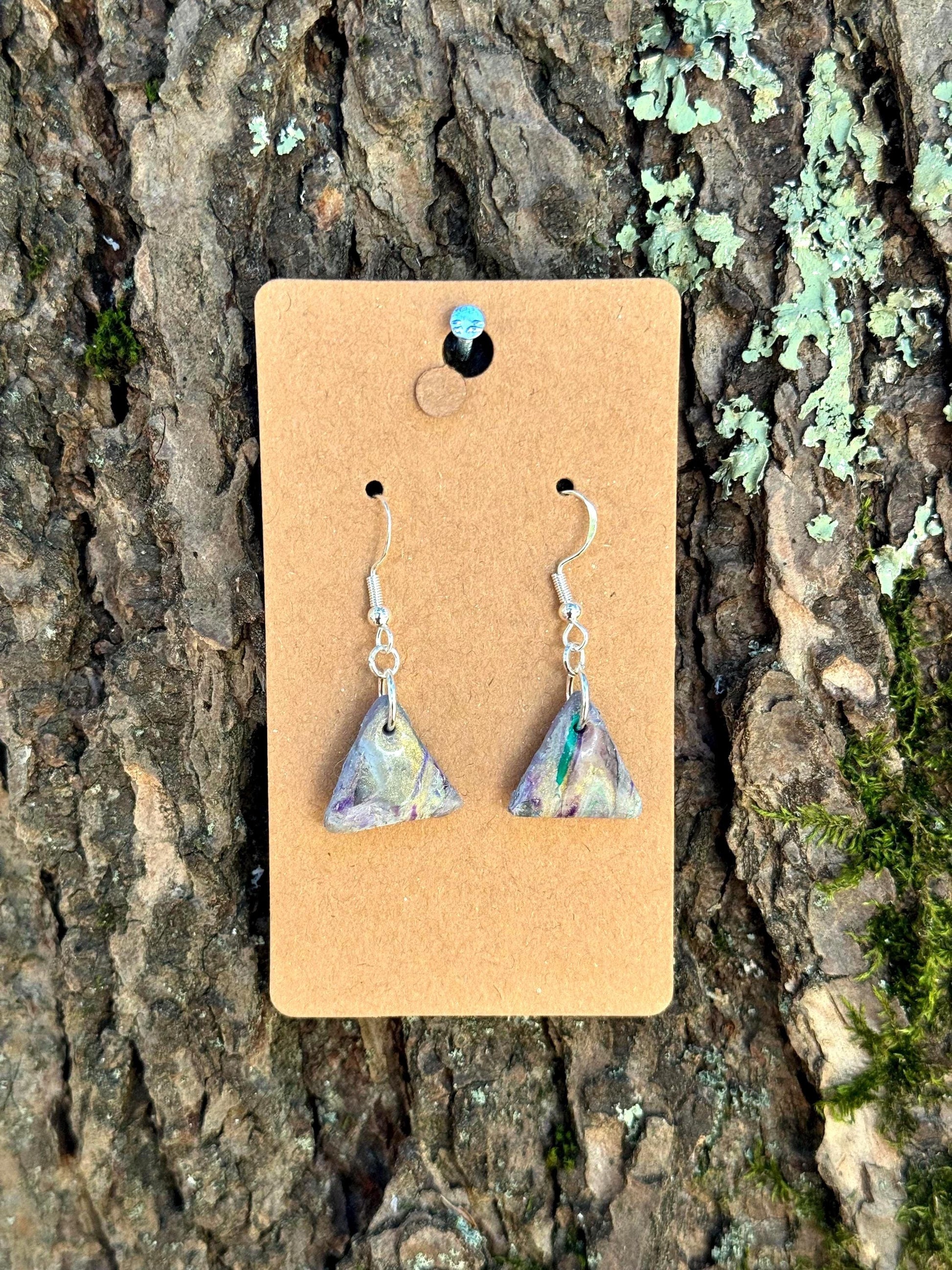 Handmade with care and a touch of sass, these polymer clay earrings feature a unique marble swirl of vibrant colors—think rich blues, fiery reds, punchy pinks, and mellow yellows—all mingling together in a bold triangular shape. Each pair is one-of-a-kind thanks to the swirling technique, so you’ll be wearing mini works of art on your ears.