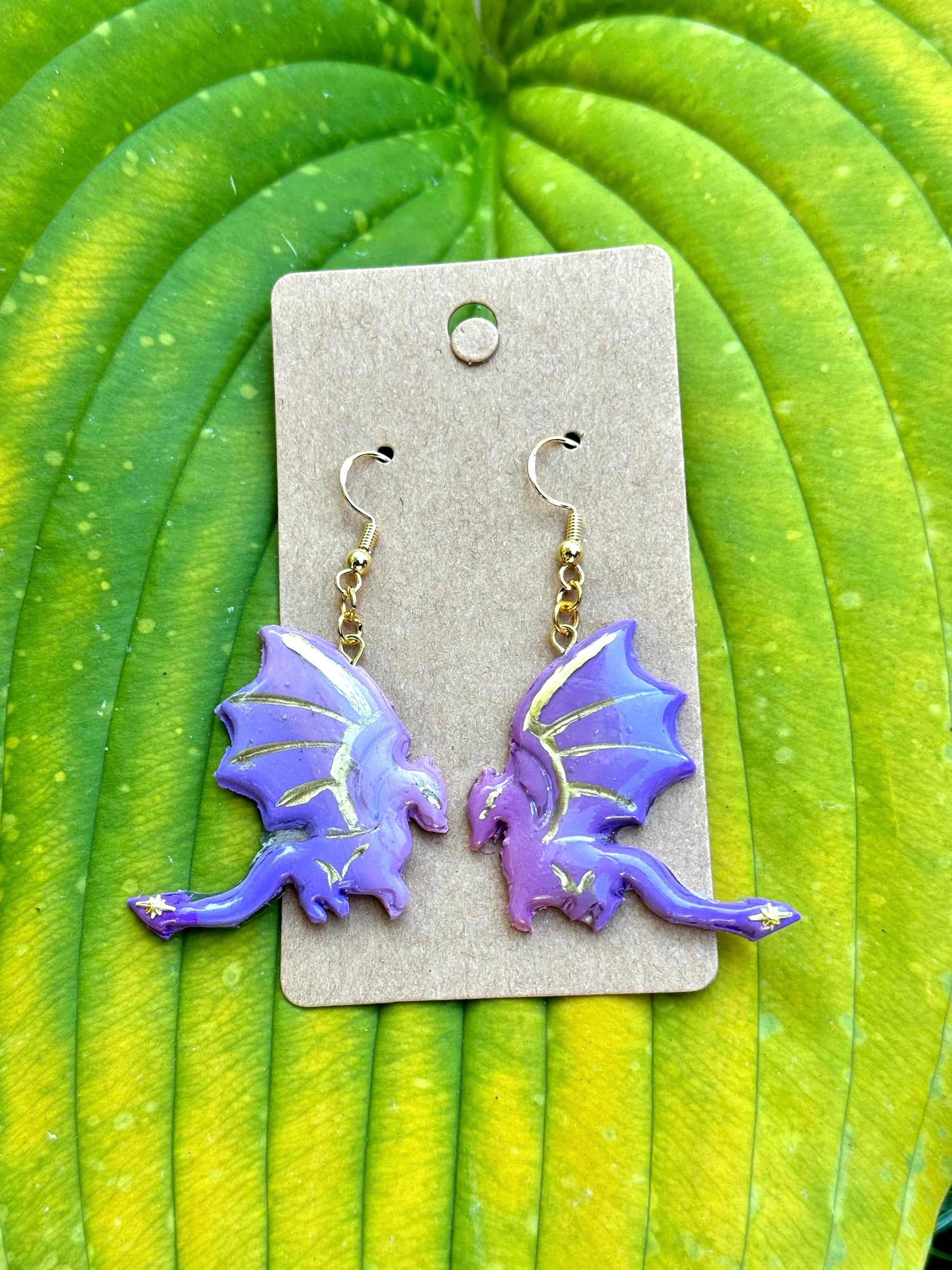 These purple dragon dangle earrings were made with polymer clay and hypoallergenic 14K Gold plated copper hooks. The charms are about 1.5 inches tall. They dangle at around 2.5 inches and come with plastic backs.