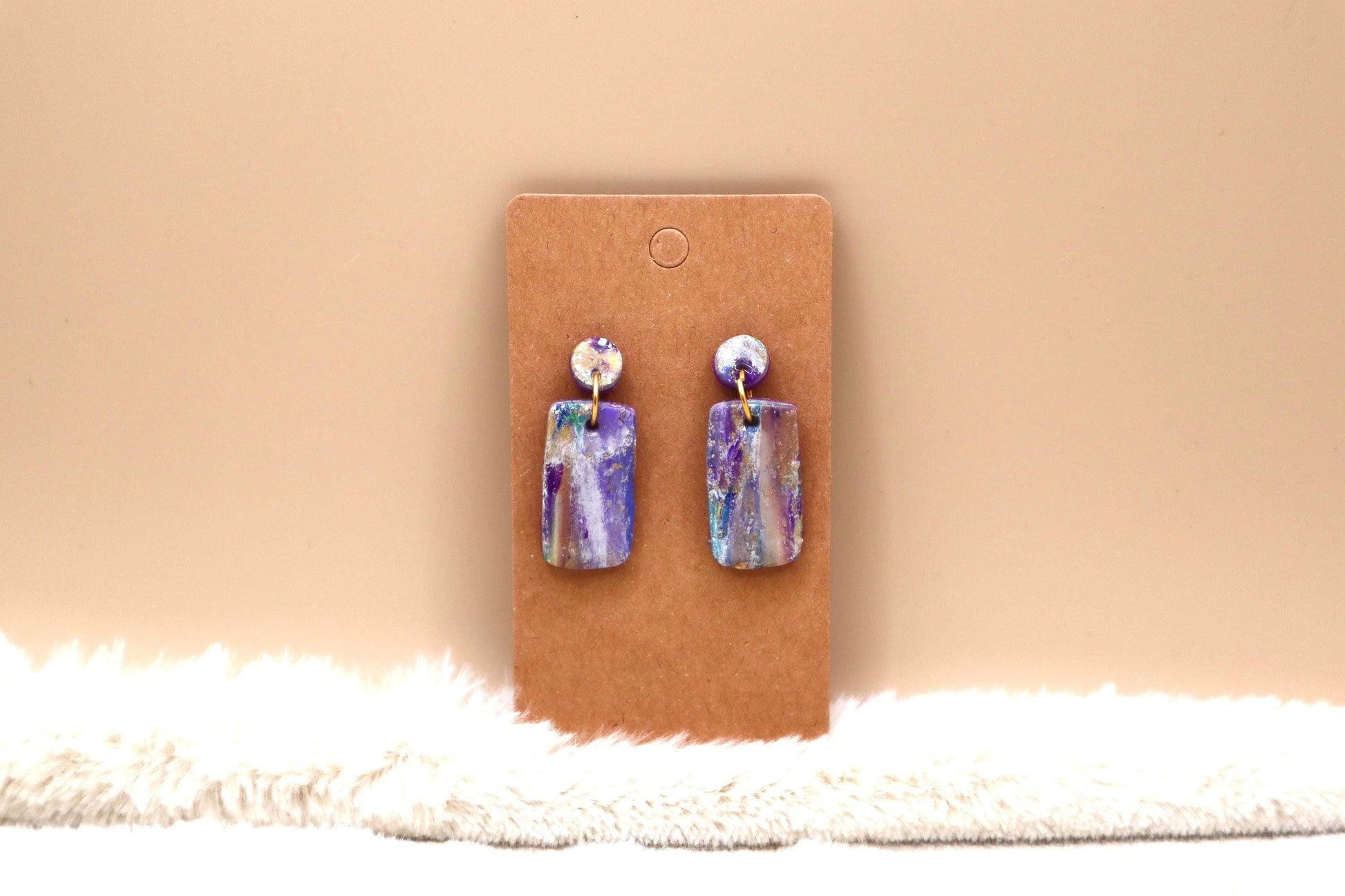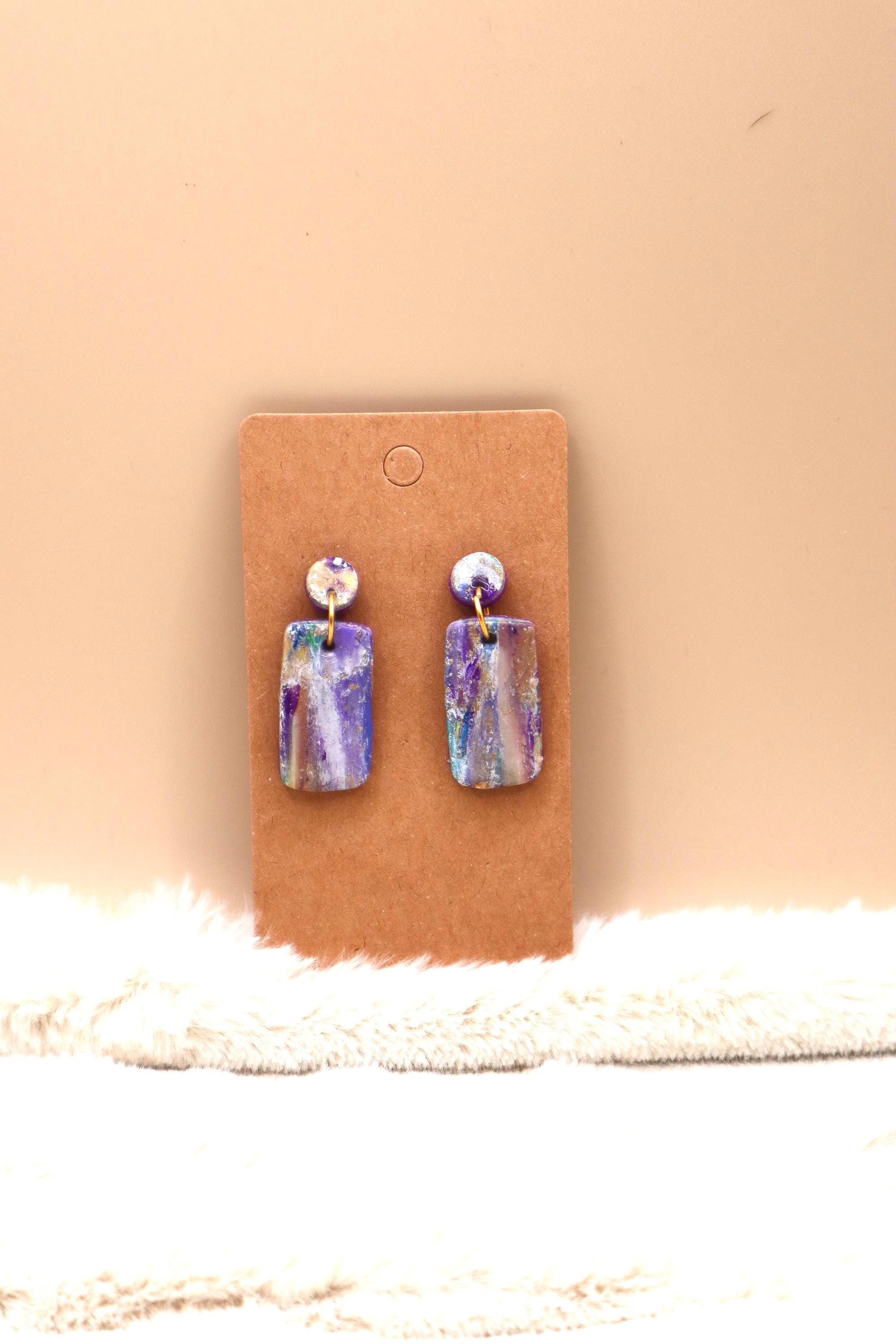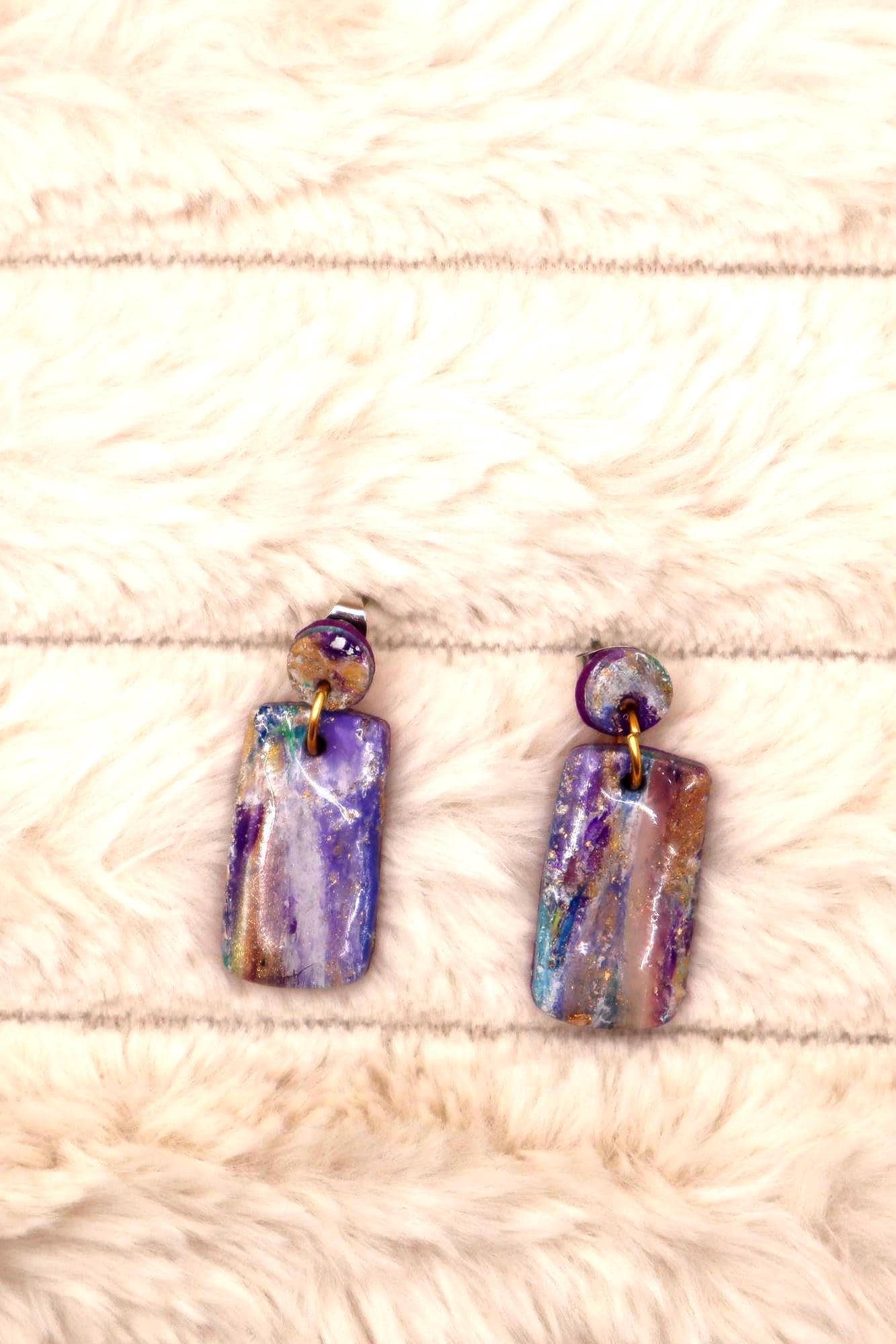 These rectangular purple marble earrings are made with polymer clay , UV resin, and steel. The charms are about 23mm tall. They dangle at around 37mm and come with metal backs.
