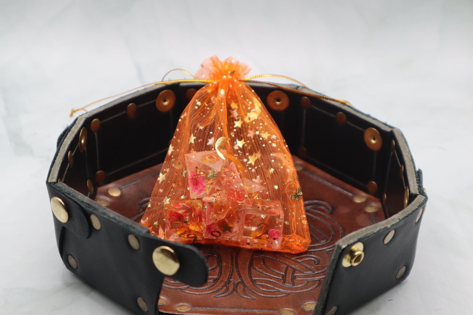 Add a burst of color and charm to your game night with this Red, Orange, and Yellow Floral Resin Dice Set — a fiery garden of polyhedral perfection. Whether you’re lighting up the battlefield with a fireball or charming your way out of trouble, these handmade beauties bring life, warmth, and a touch of nature magic to every roll. Each die in this set is lovingly handcrafted with real dried flowers, suspended in crystal-clear resin for a vibrant, sun-soaked look. The bold blend of red, orange, and yellow evokes glowing embers, golden sunsets, and enchanted meadows in full bloom — all packed into your favorite gaming essentials.