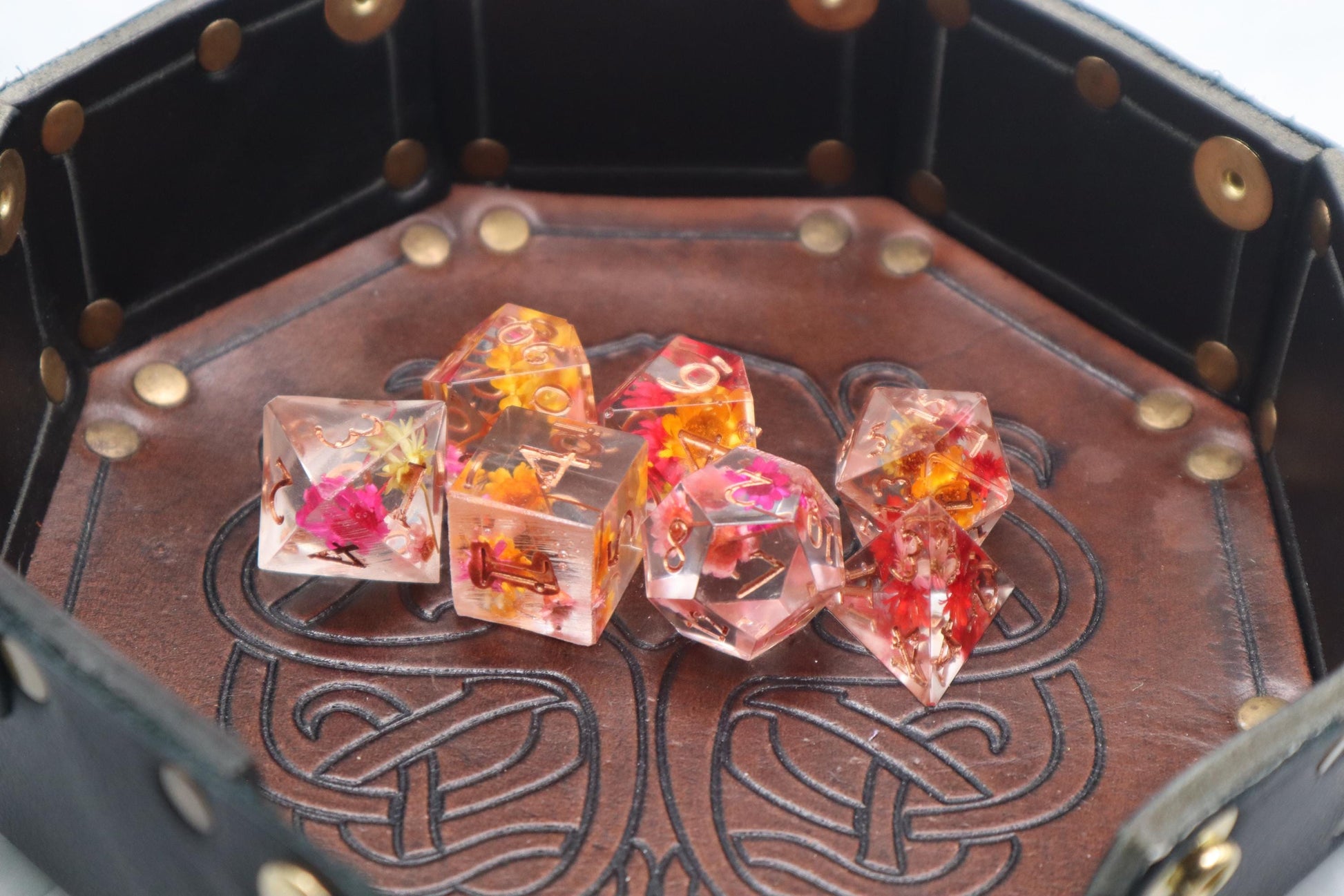 🌻 Why they stand out: These dice aren’t mass-produced — they’re handcrafted in small batches, making each set unique and infused with creative care. The floral inclusions are individually placed, giving every piece a distinct character. No two sets are exactly alike — much like your party members.