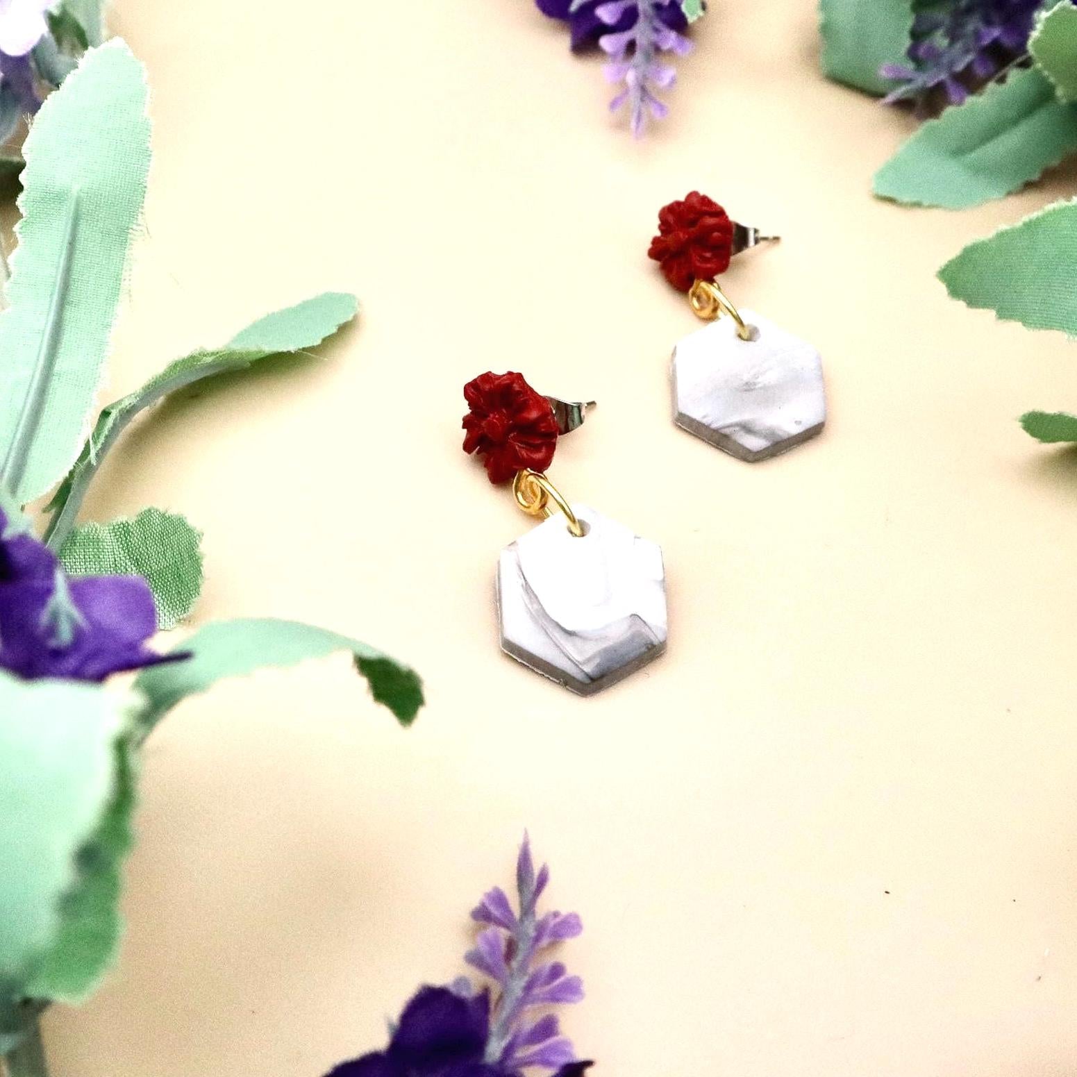 Red Rose and Marble Hexagon Dangle Earrings | Polymer Clay