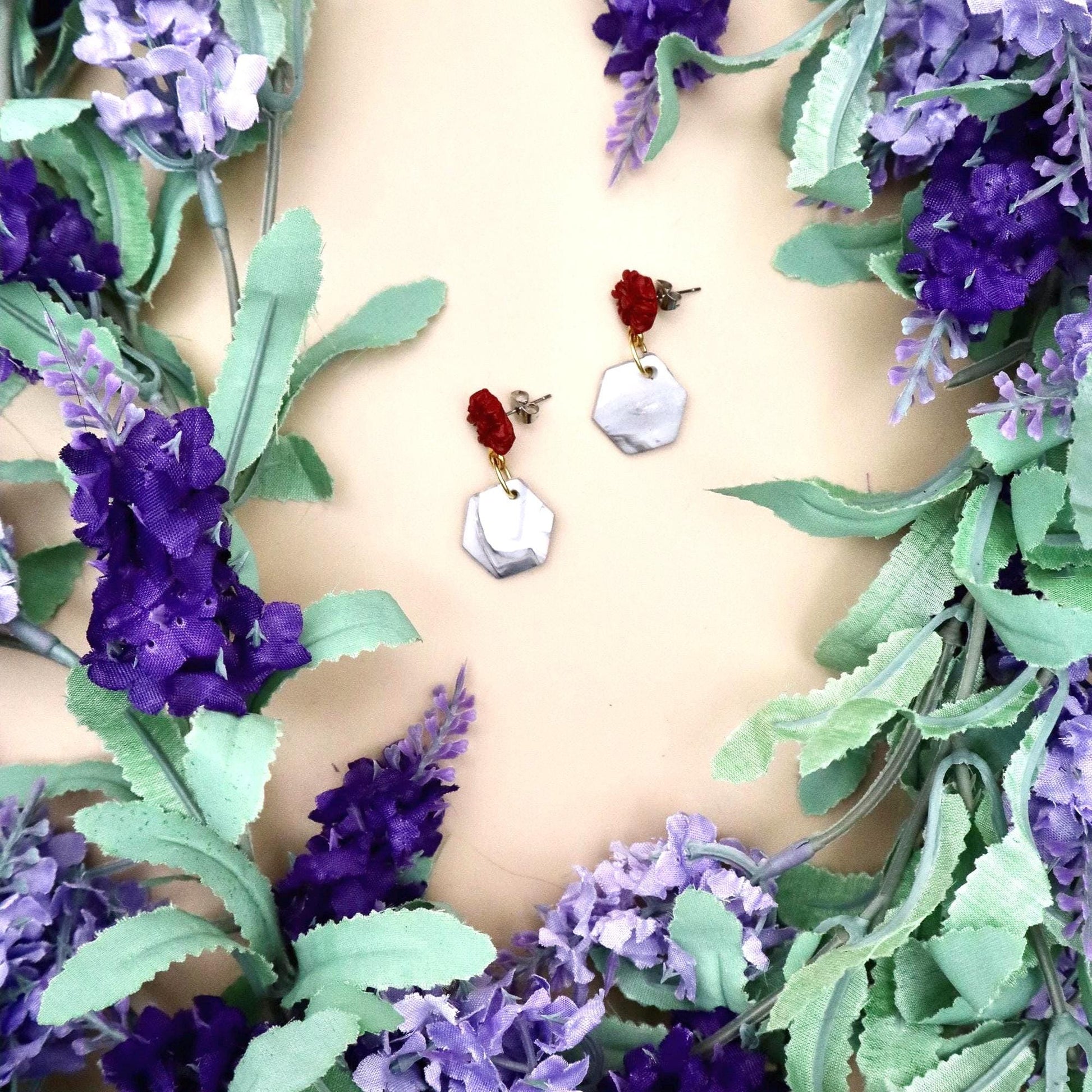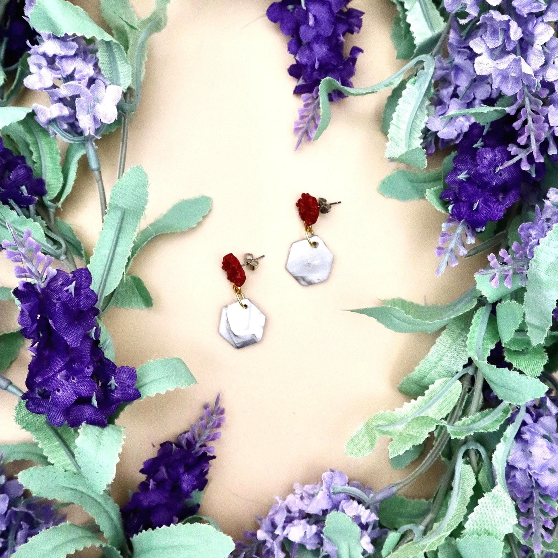 Introducing your next favorite pair of earrings: the Red Rose and Marble Hexagon Dangles, where timeless romance meets modern geometry — all handcrafted with love and a touch of sass.