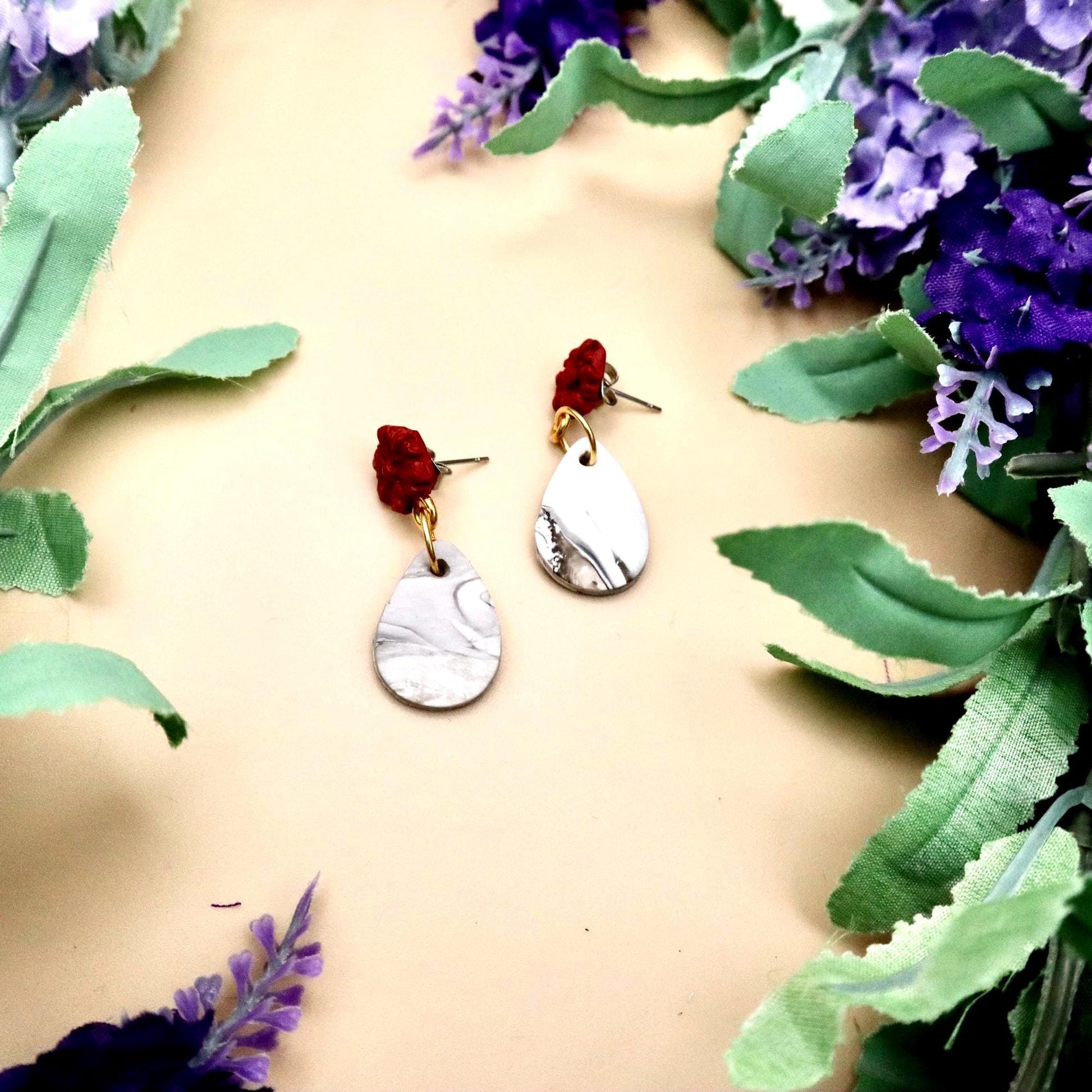 Each earring features a dramatic teardrop shape marbled with elegant swirls of white and grey — like sculpted stone, but way more lightweight. Sitting atop this classy chaos? A hand-sculpted red rose, blooming with just the right amount of flair. Think of them as a love letter from your lobes.