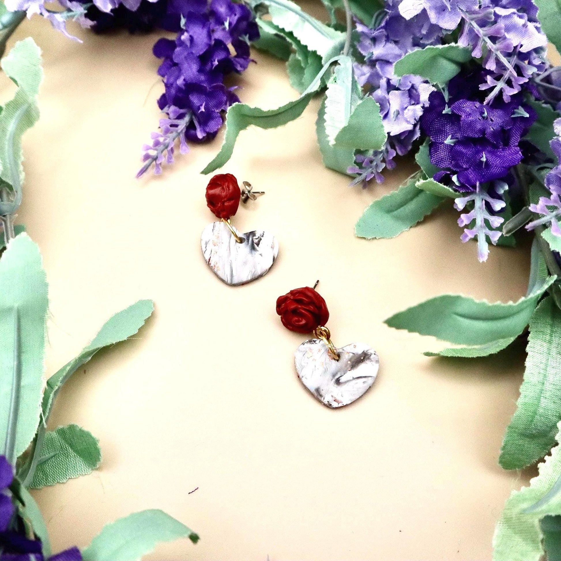 Say hello to the perfect pair of romantic statement earrings you didn’t know your jewelry box was missing — the Red Rose and Rose Gold Marble Heart Dangle Earrings, handcrafted with love and a little bit of sass from polymer clay.
