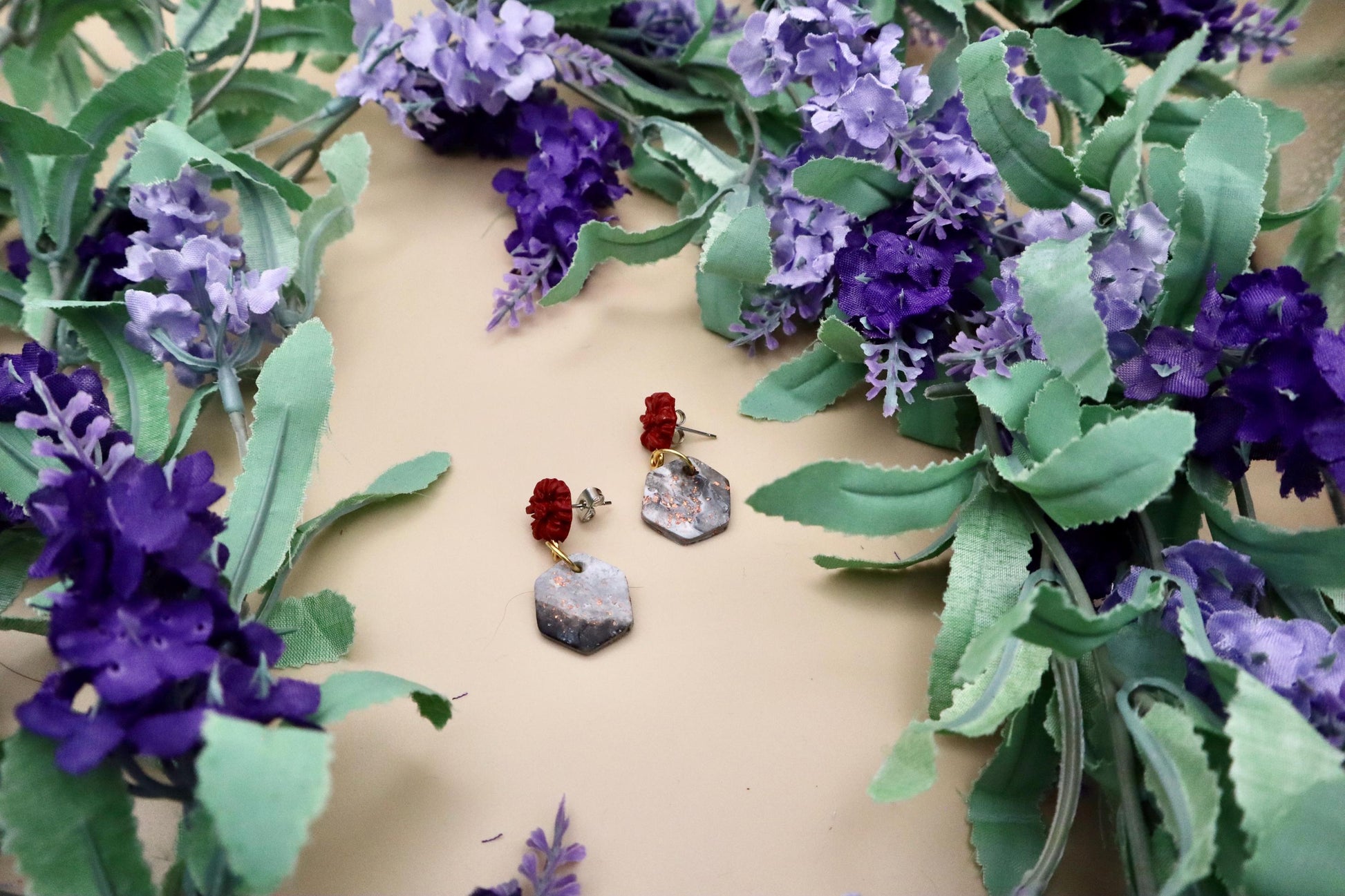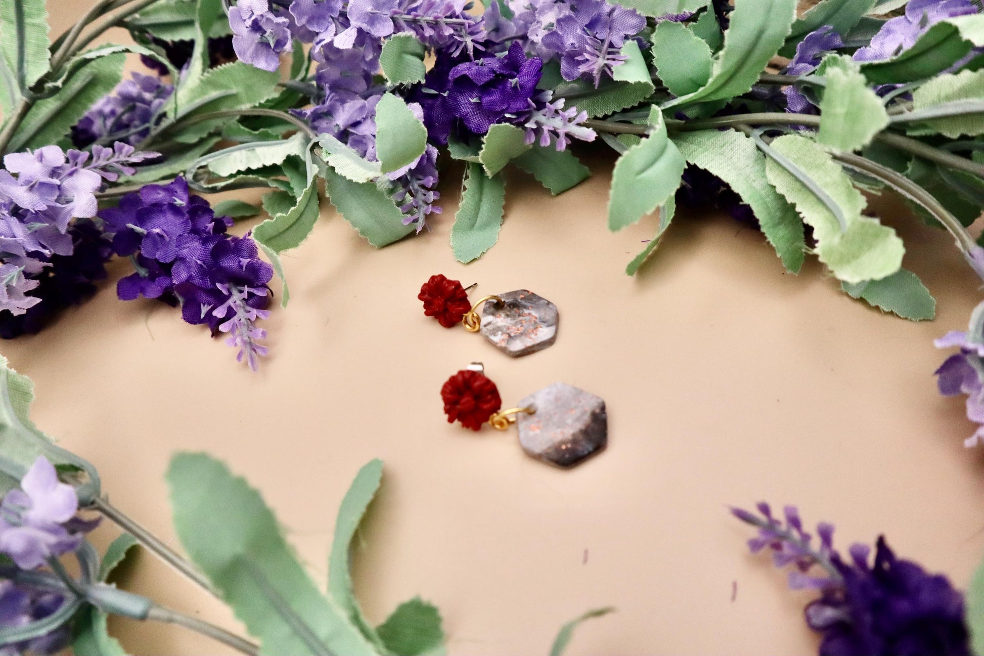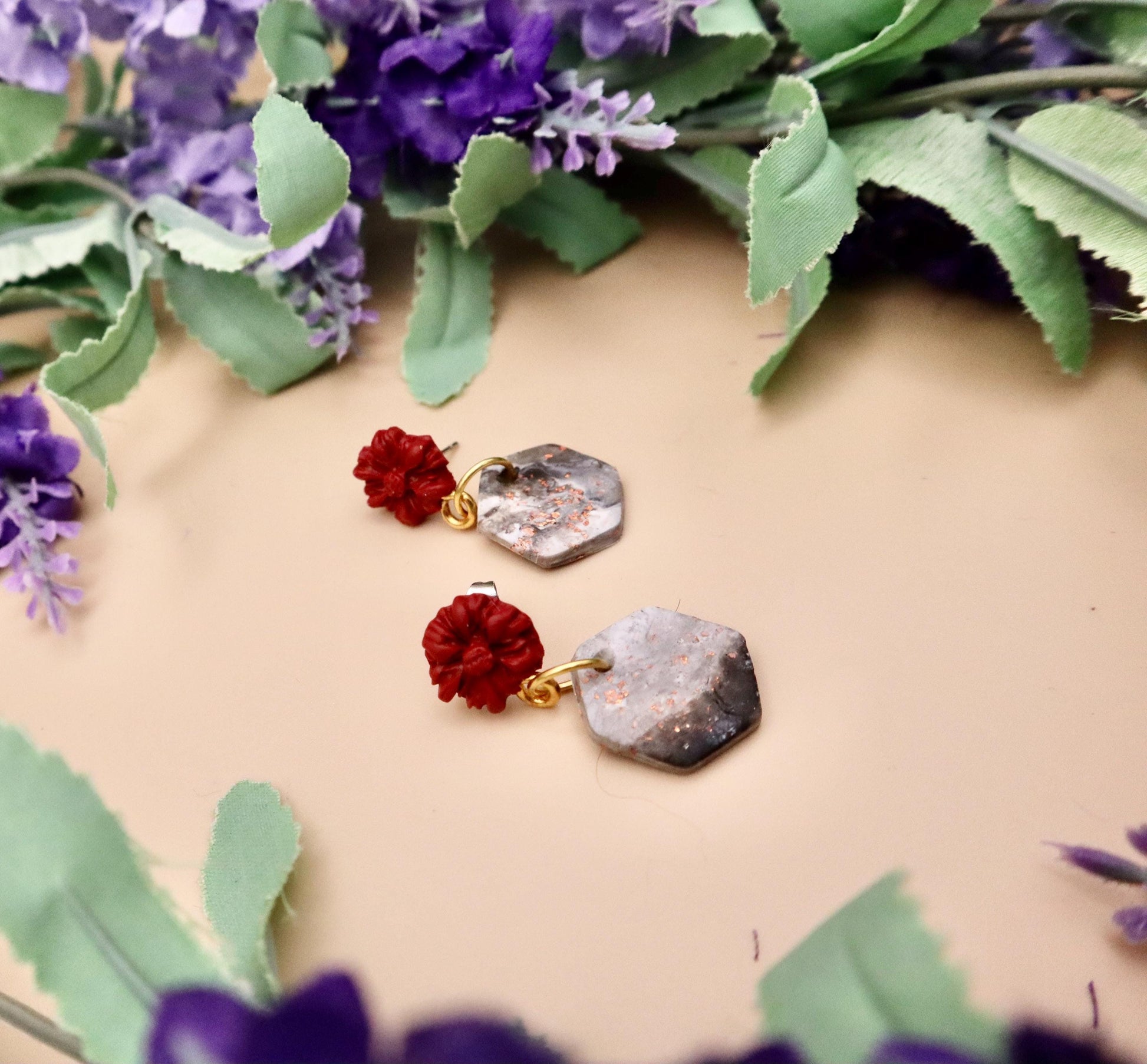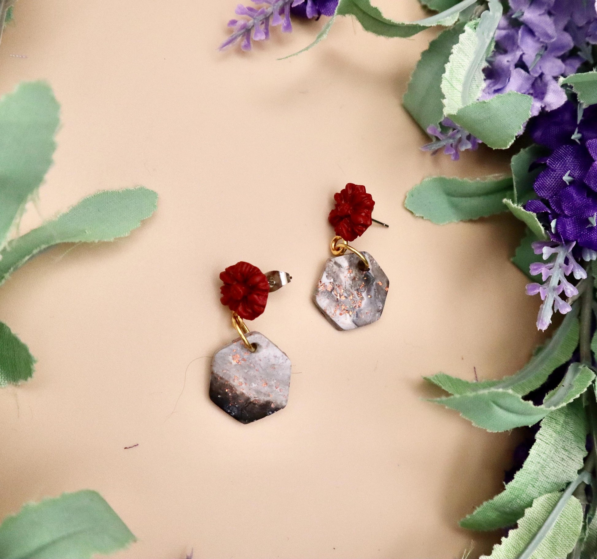 Red Rose and Rose Gold Marble Hexagon Dangle Earrings | Polymer Clay
