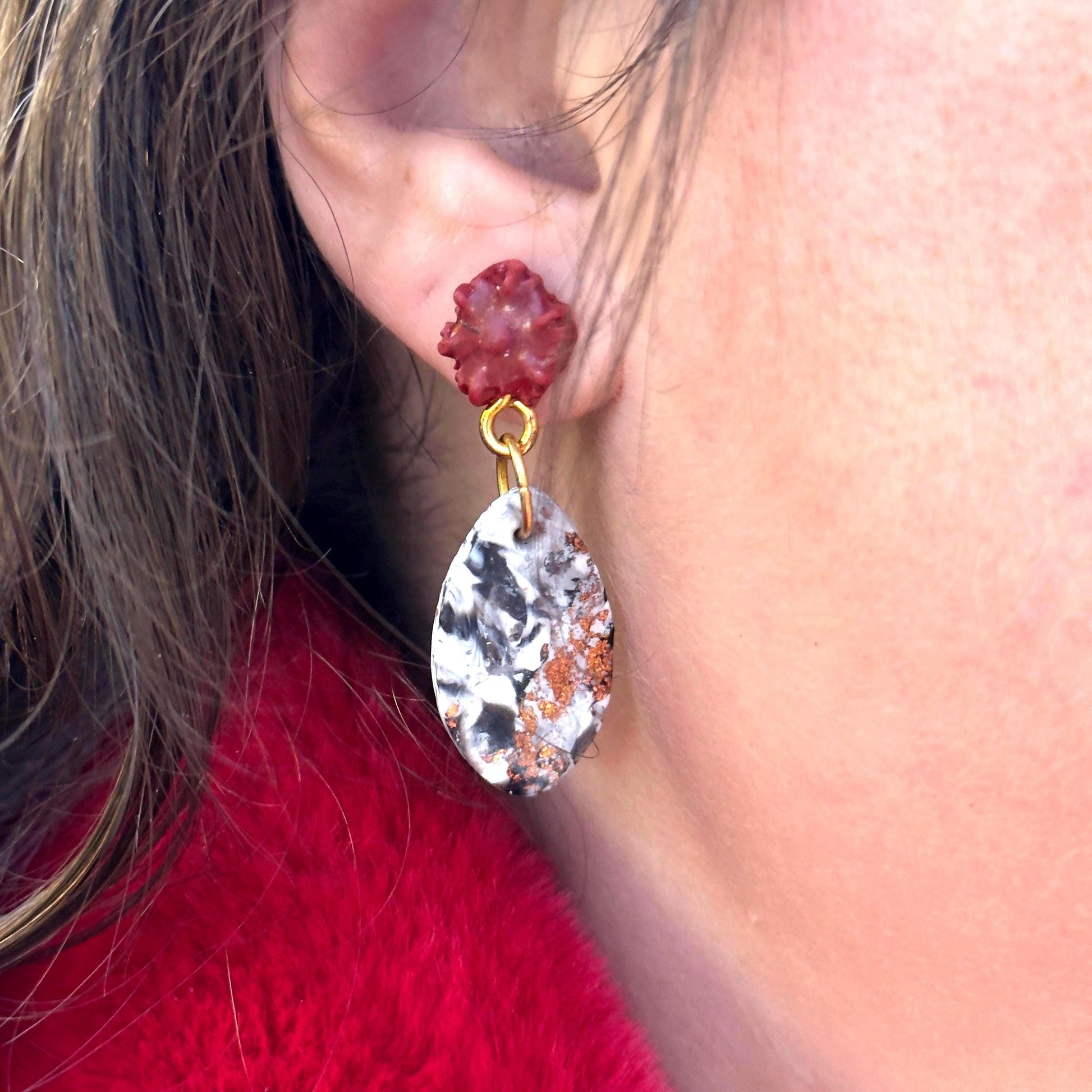 Red Rose and Rose Gold Marble Oval Dangle Earrings | Polymer Clay